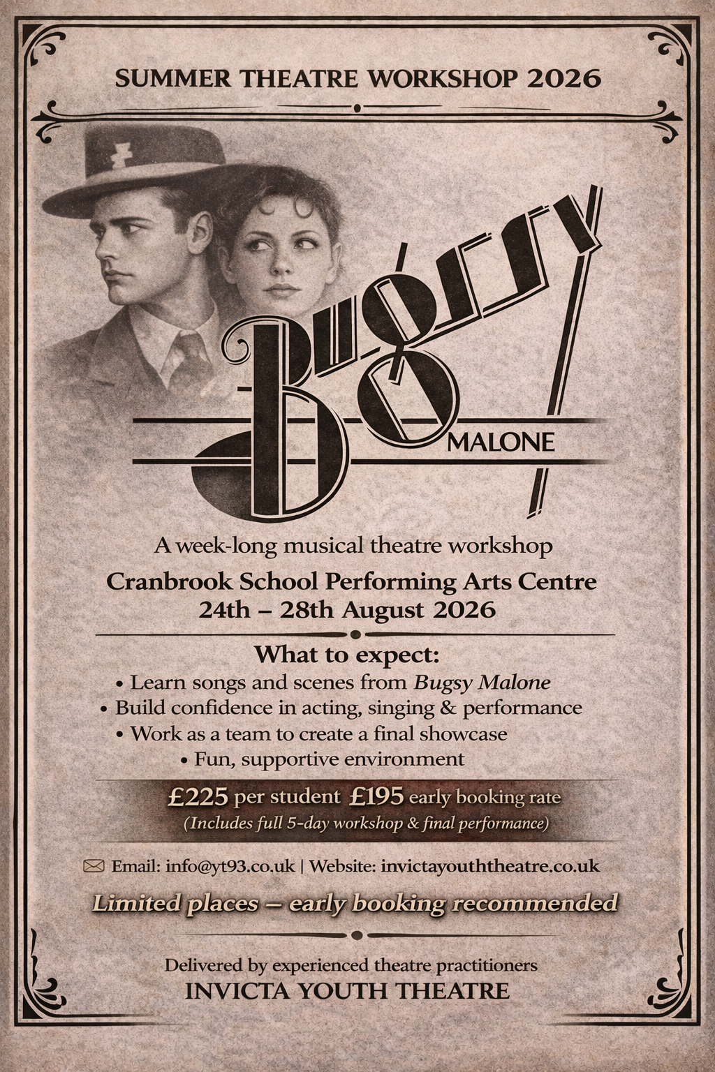 You can register and book here👉 :Bugsy Malone Summer Workshop – Registration Form – Fill in form